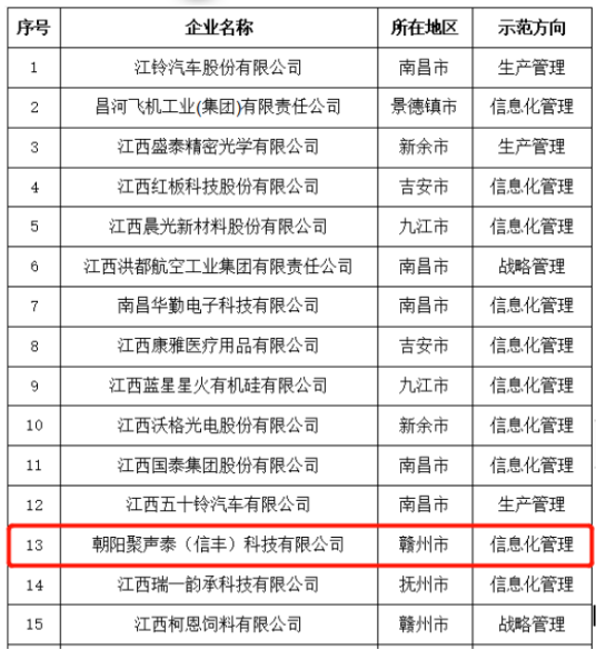 近日,江西省工業(yè)和信息化廳在其官網(wǎng)發(fā)布了《關(guān)于公布2021年度江西省管理創(chuàng)新示范企業(yè)認(rèn)定名單的通知》(贛工信企指字〔2022〕42號(hào))。朝陽聚聲泰(信豐)科技有限公司入選2021年度江西管理創(chuàng)新示范企業(yè)名單。