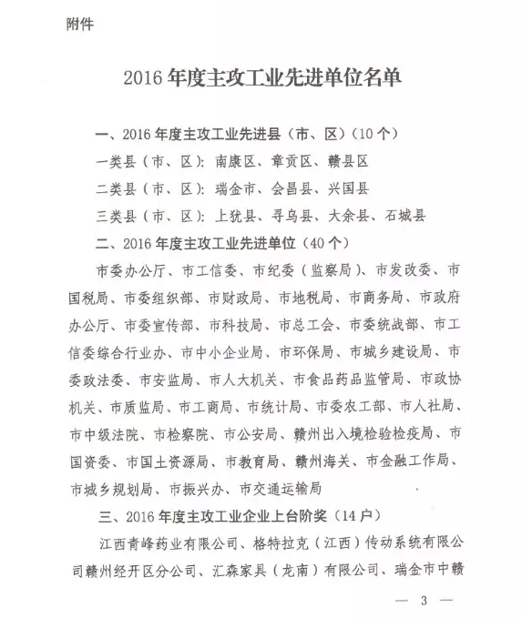 近日,贛州市委、市政府印發(fā)贛市字〔2017〕8號文件,通報表彰全市2016年度主攻工業(yè)先進(jìn)單位,167個縣(市、區(qū))、市直(駐市)部門和企業(yè)獲得表彰。其中,南康區(qū)、瑞金市、上猶縣等10個縣(市、區(qū))榮獲“2016年度主攻工業(yè)先進(jìn)縣(市、區(qū))”稱號;市委辦公廳、市工信委等40個單位榮獲“2016年度主攻工業(yè)先進(jìn)單位”稱號;江西青峰藥業(yè)有限公司等14戶企業(yè)榮獲“2016年度主攻工業(yè)企業(yè)上臺階獎”;贛州市深聯(lián)電路有限公司等103戶企業(yè)榮獲“2016年度主攻工業(yè)成長型企業(yè)獎”。