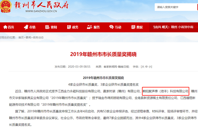 2019年贛州市市長質量獎申報工作從去年4月啟動,共有53家企業(yè)申報評選,經過資格審查、材料評審、現(xiàn)場評審等環(huán)節(jié),并經贛州市市長質量獎評審委員會議審議、社會公示、市政府常務會審定,最終4家公司入圍。朝陽聚聲泰(信豐)科技有限公司脫穎而出,被贛州市人民政府正式授予2019年贛州市市長質量獎。